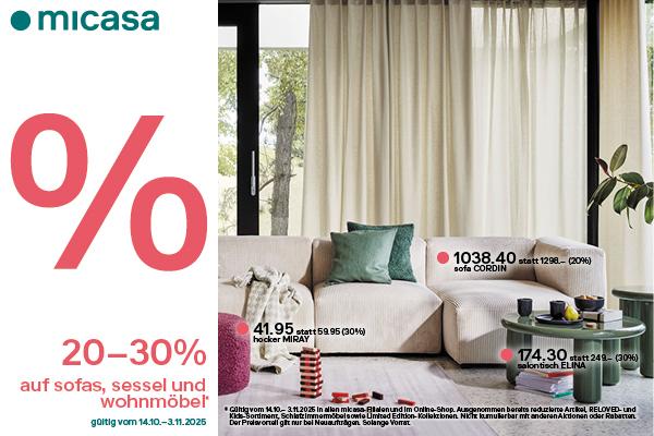 Profitiere jetzt bei micasa von 20–30 % auf Sofas, Sessel und Wohnmöbel – stilvoll wohnen, clever sparen.