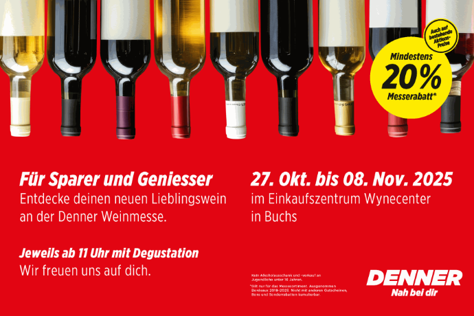 Weinliebhaber*innen aufgepasst. Vom Montag, 27. Oktober bis Samstag, 08. November erwartet dich hier im Einkaufszentrum Wynecenter die Denner Weinmesse mit einer erlesenen Auswahl an Weinen. Der Messestand befindet sich im Erdgeschoss direkt vor der Denner Filiale.